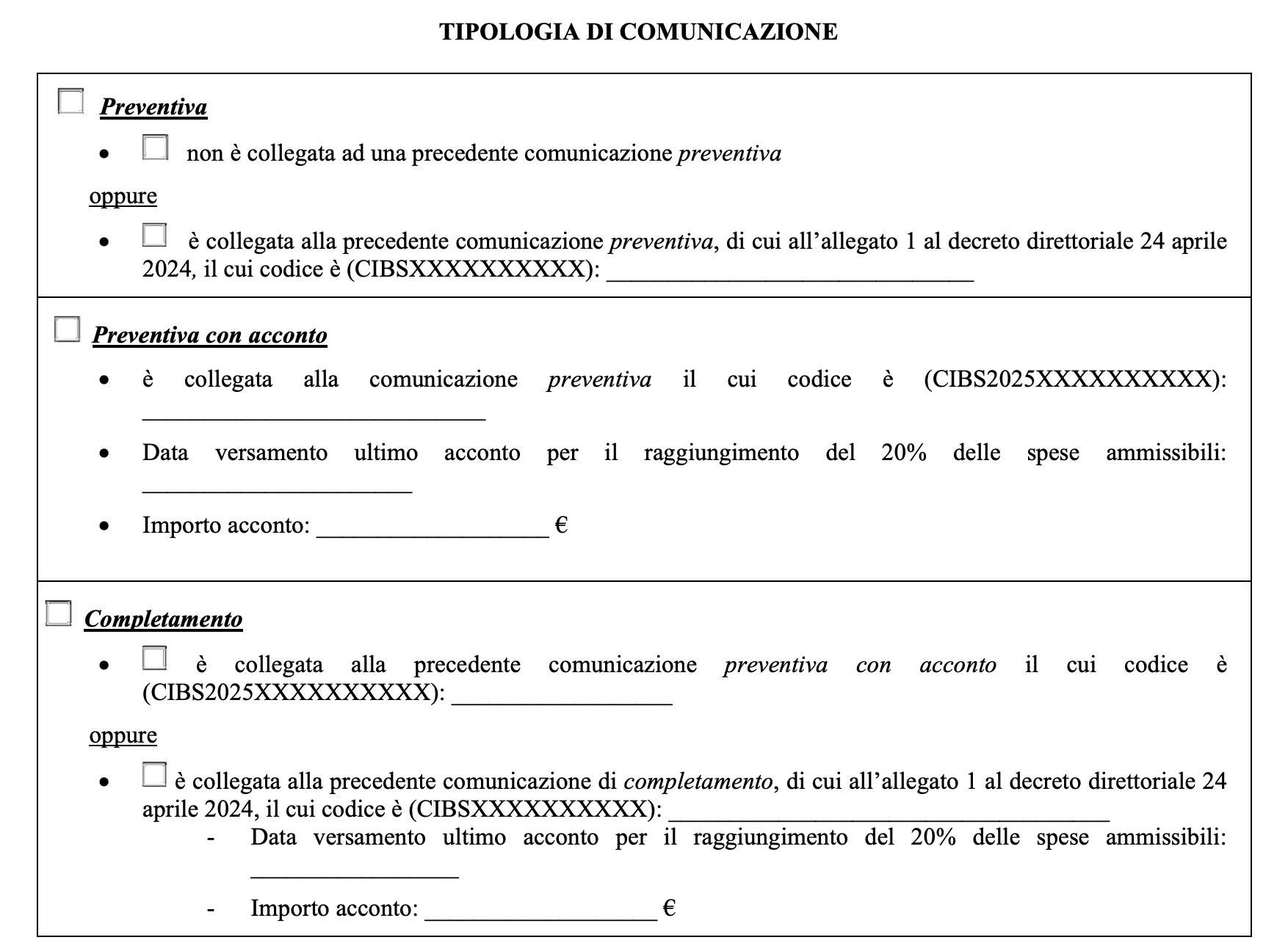 - Completamento dell’investimento: il modello è sempre lo stesso ma prevede di barrare l’apposita casella. L’impresa richiedente deve effettuare l’invio entro il 31 gennaio 2026 per gli investimenti ultimati alla data del 31 dicembre 2025, oppure entro il 31 luglio 2026 per gli investimenti completati al 30 giugno 2026.